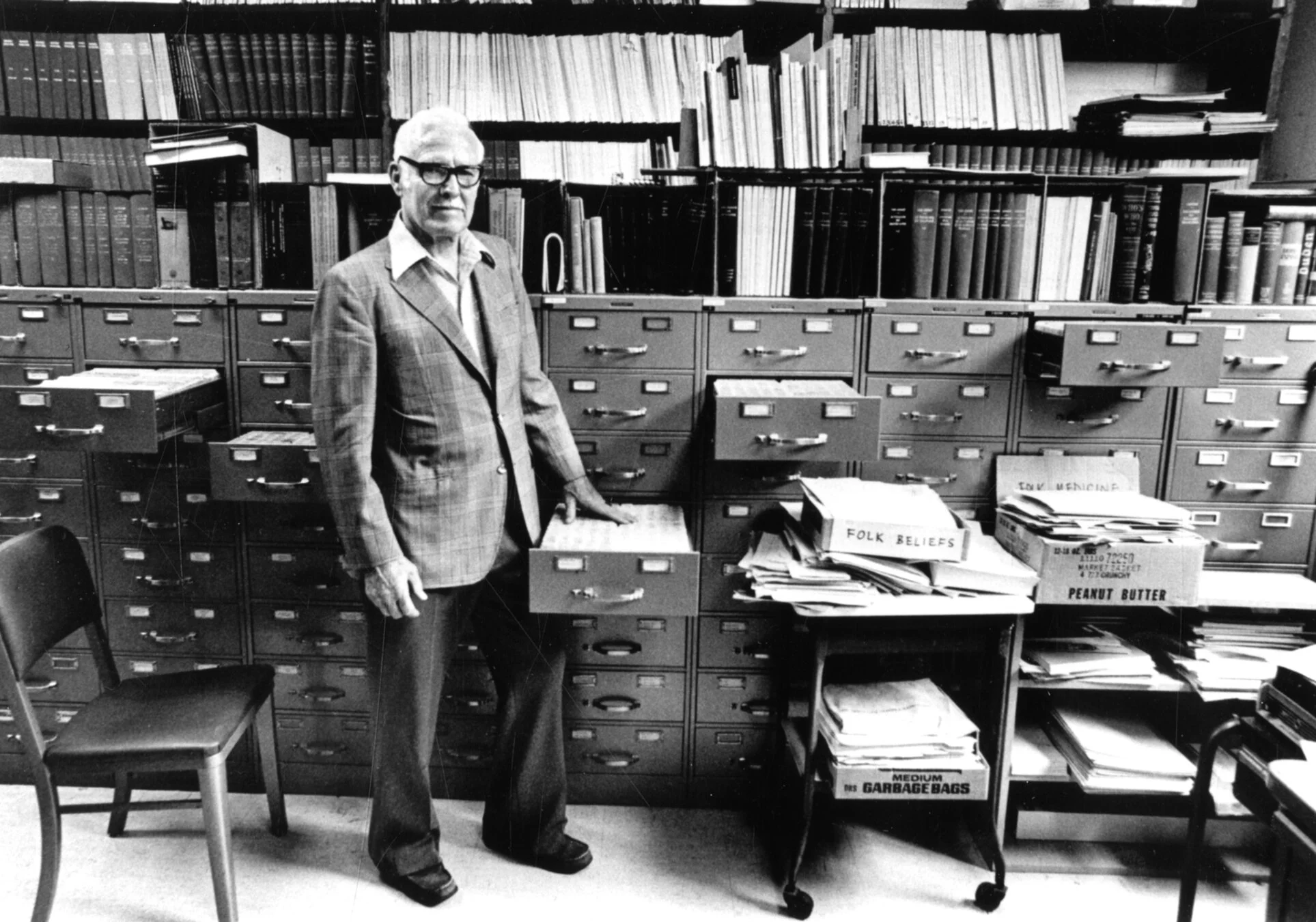 Wayland Hand in the folklore archives, named after him, at UCLA